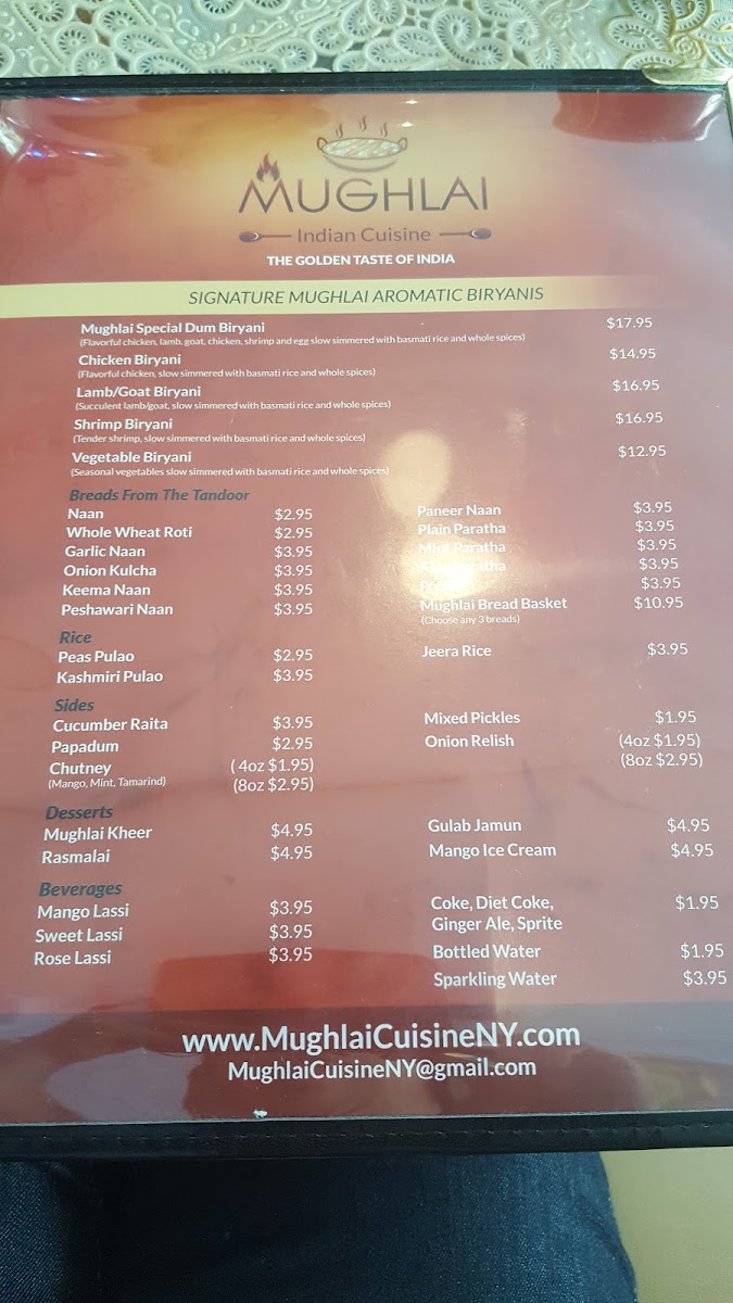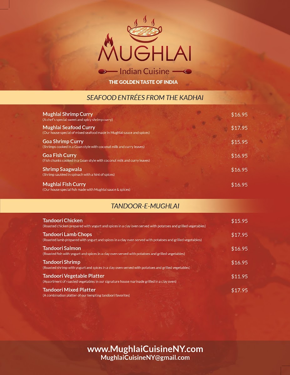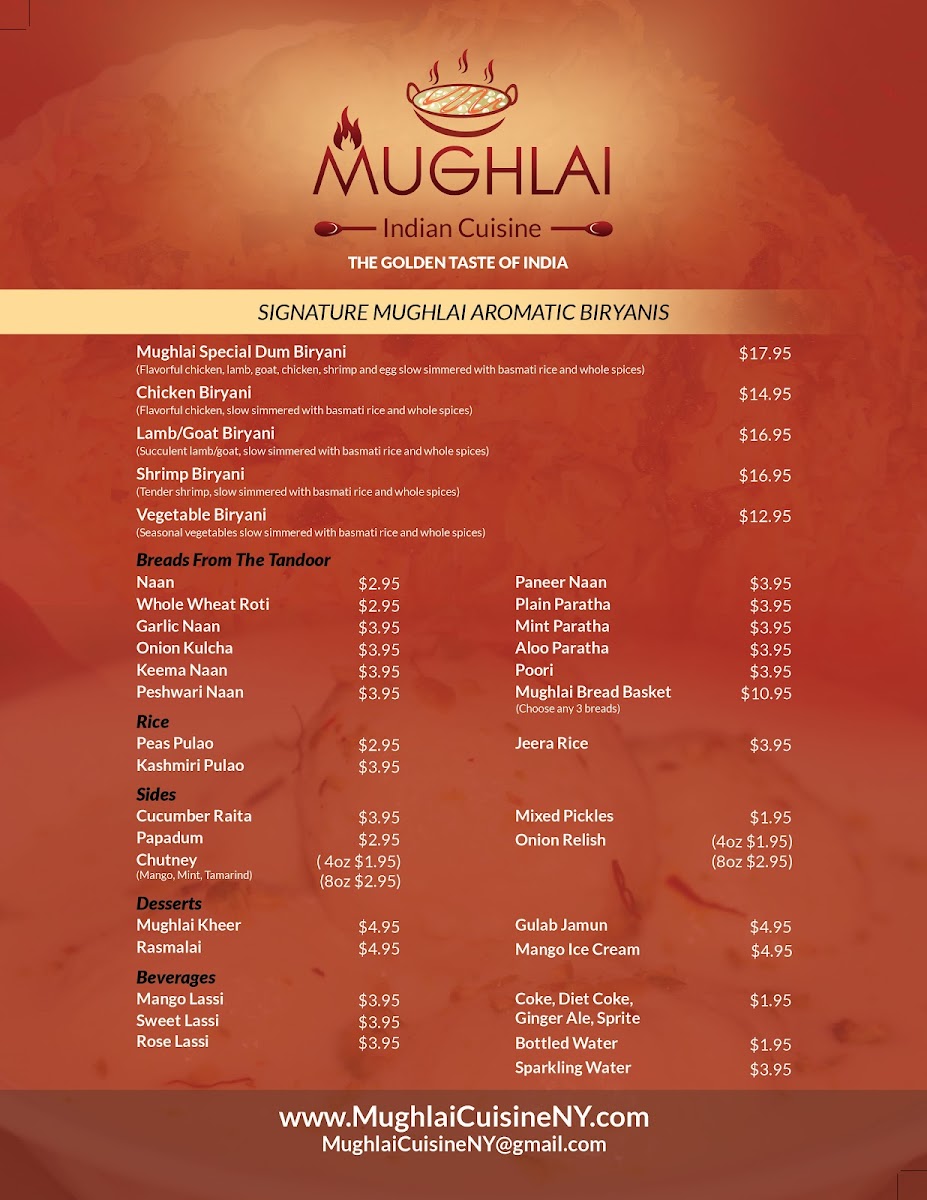 If you’re craving authentic and flavorful Indian cuisine, look no further than Mughlai Indian Cuisine Menu. Nestled in the heart of New York, this spot brings the rich, vibrant flavors of Mughlai cooking right to your table. With an impressive selection of traditional dishes, you’ll find everything from aromatic biryanis to tender kebabs and creamy curries, all crafted with the freshest ingredients. Whether you’re in the mood for something mild or bold, each dish is expertly seasoned to deliver the perfect balance of spices. Enjoy a meal that truly captures the essence of Indian culinary heritage, offering a warm and welcoming atmosphere for all who walk through the door. Whether you're dining in or ordering takeout, Mughlai Indian Cuisine Menu is sure to satisfy every craving for rich, flavorful comfort food.